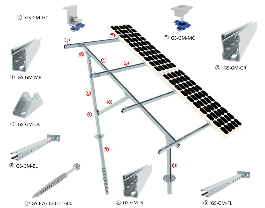 Galvanized Steel Ground Structure System is applicable for PV array system on the open fields. For different foundation solutions, such as concrete with the pre-buried bolt, direct buried and ground screw, the system can be modified to install. The material used includes galvanized steel and anodized aluminium components, with great anti-corrosive suitable for outdoor using.