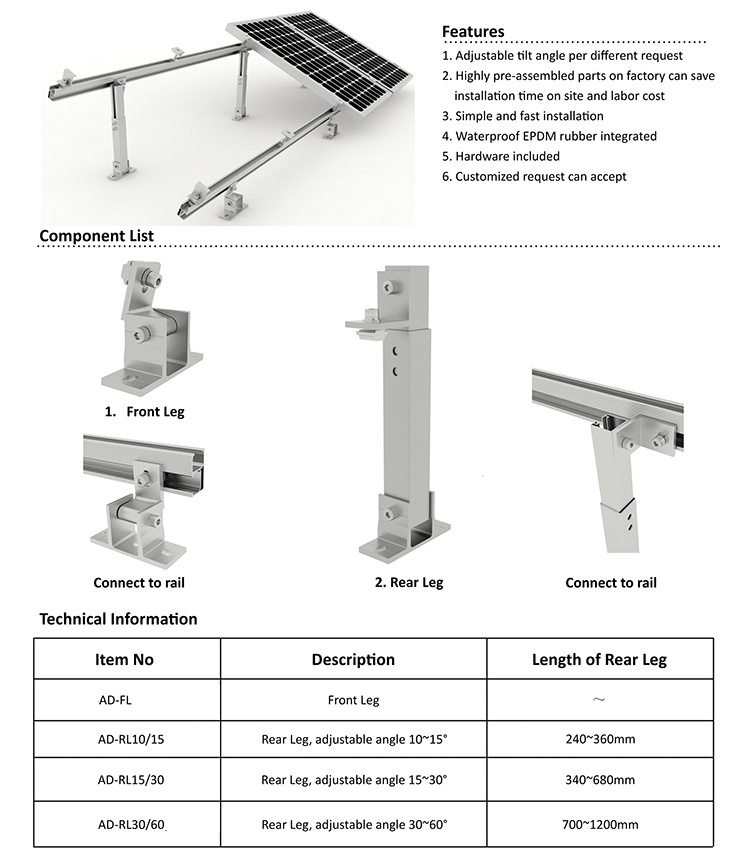 5) Variable lengths tilt to 10-15, 15-30, and 30-60 degrees
